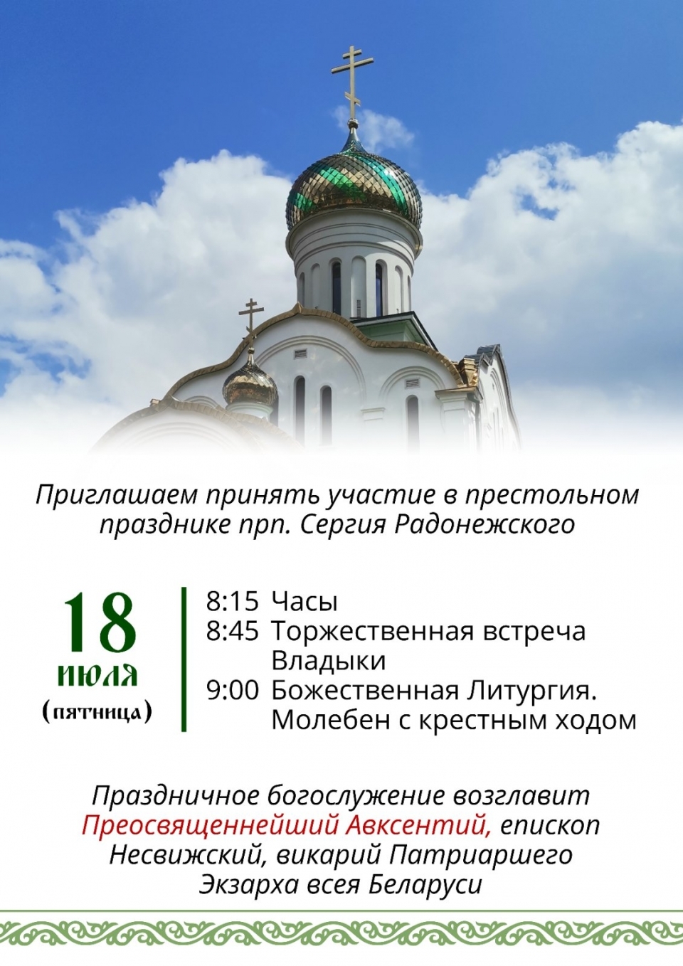 ПРИГЛАШАЕМ НА ПРАЗДНИЧНОЕ БОГОСЛУЖЕНИЕ 18 ИЮЛЯ. СЛУЖБУ ВОЗГЛАВИТ ВЛАДЫКА АВКСЕНТИЙ